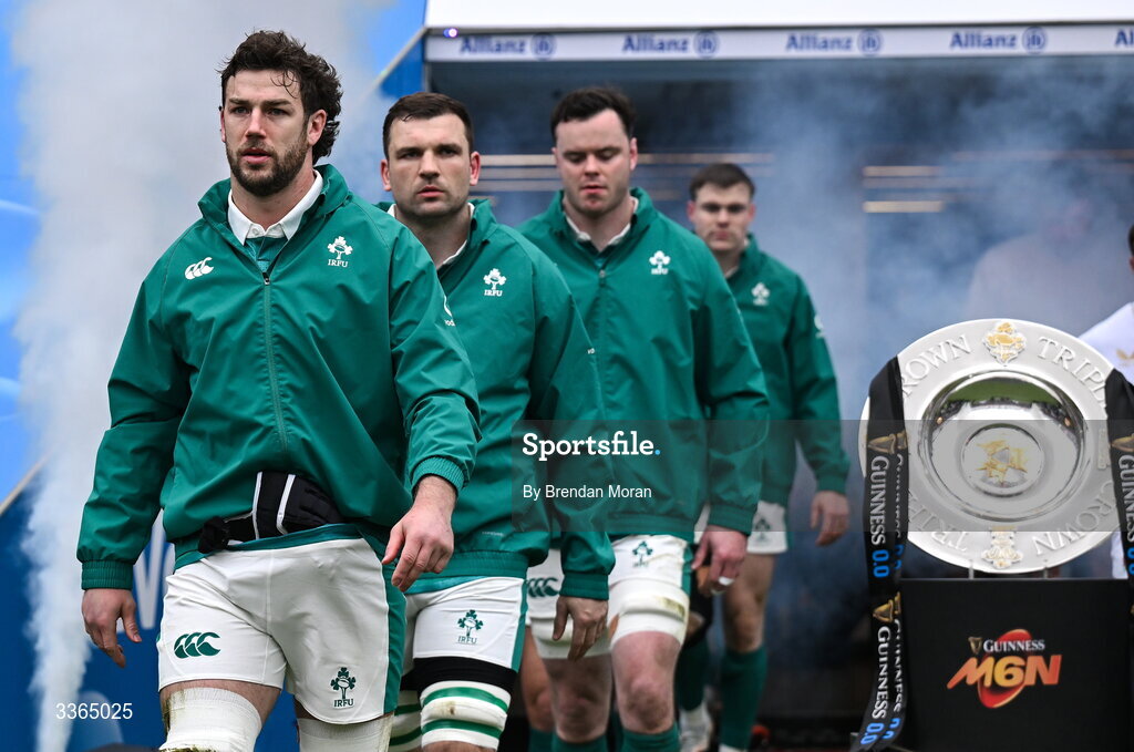 21 February 2026; Ireland captain Caelan Doris leads his side onto the pitch before the Guinness 6 Nations Rugby Championship match between England and Ireland at the Allianz Stadium in Twickenham, England. Photo by Brendan Moran/Sportsfile