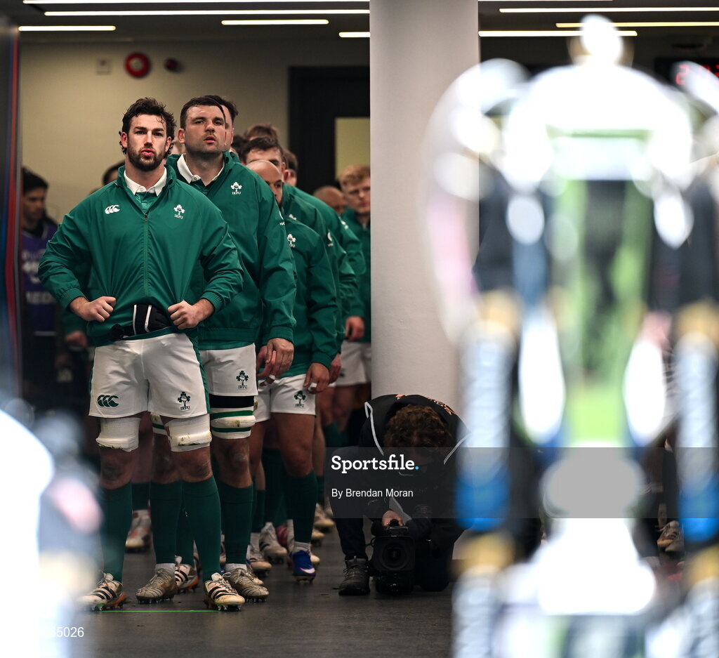 21 February 2026; Ireland captain Caelan Doris prepares to lead his side onto the pitch before the Guinness 6 Nations Rugby Championship match between England and Ireland at the Allianz Stadium in Twickenham, England. Photo by Brendan Moran/Sportsfile