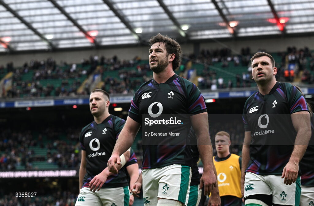 21 February 2026; Ireland captain Caelan Doris leads his team into the dressingroom after their warm up before the Guinness 6 Nations Rugby Championship match between England and Ireland at the Allianz Stadium in Twickenham, England. Photo by Brendan Moran/Sportsfile