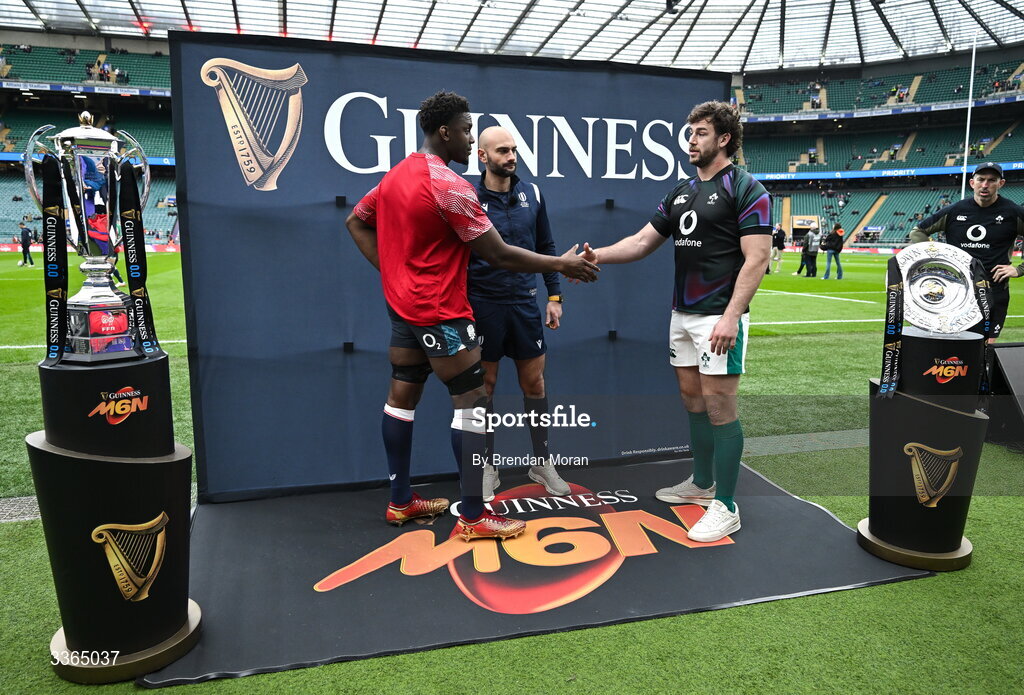 21 February 2026; Team captains Maro Itoje of England, left, and Caelan Doris of Ireland, shake hands, in the company of referee Andrea Piardi before the Guinness 6 Nations Rugby Championship match between England and Ireland at the Allianz Stadium in Twickenham, England. Photo by Brendan Moran/Sportsfile