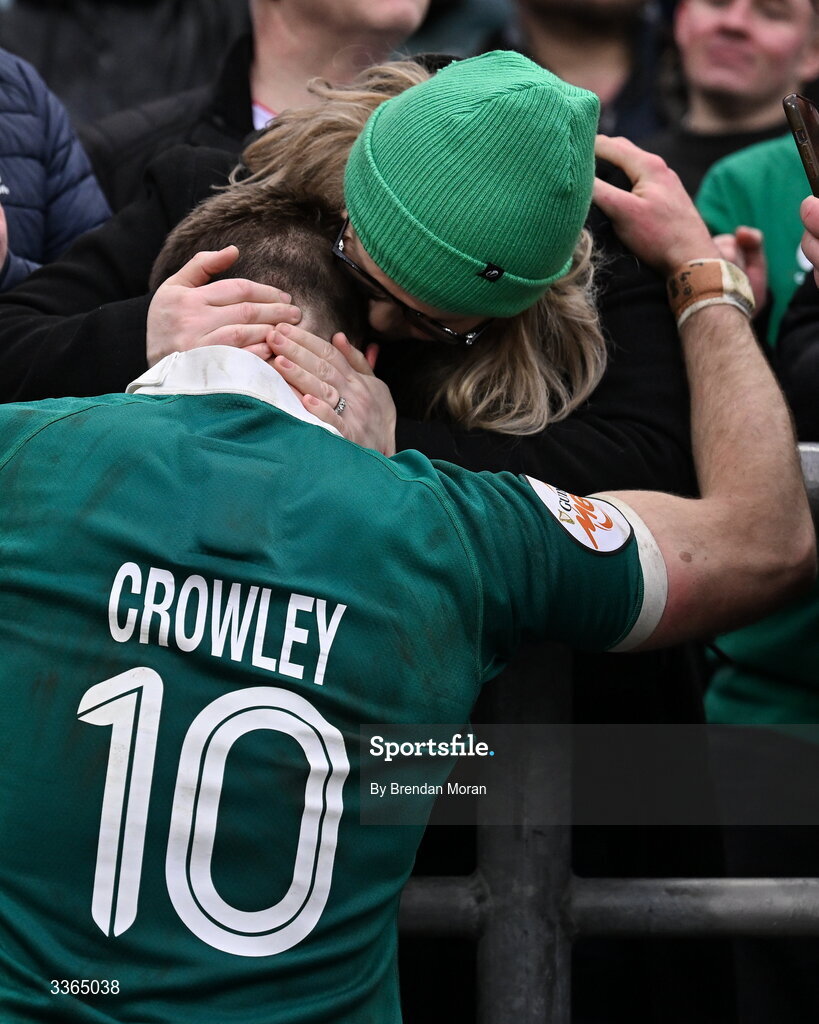 21 February 2026; Jack Crowley of Ireland is congratulated after the Guinness 6 Nations Rugby Championship match between England and Ireland at the Allianz Stadium in Twickenham, England. Photo by Brendan Moran/Sportsfile