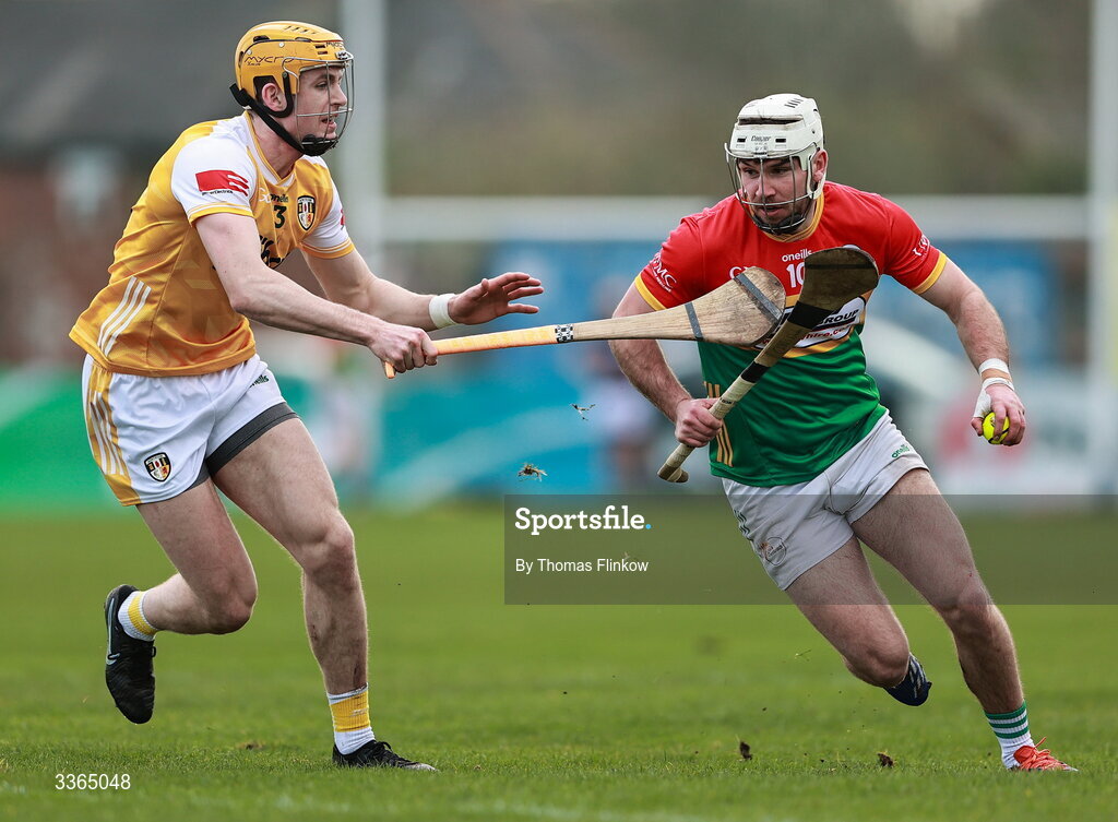 22 February 2026; Chris Nolan of Carlow in action against Niall O'Connor of Antrim during the Allianz Hurling League Division 1A match between Antrim and Carlow at Corrigan Park in Belfast. Photo by Thomas Flinkow/Sportsfile