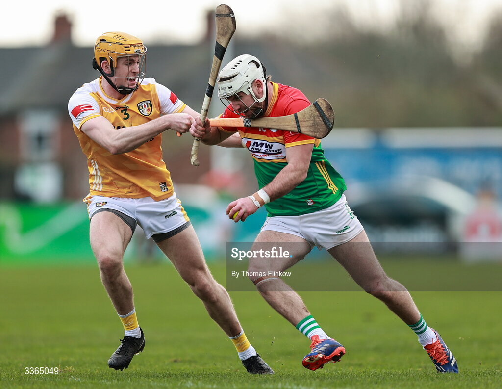 22 February 2026; Chris Nolan of Carlow in action against Niall O'Connor of Antrim during the Allianz Hurling League Division 1A match between Antrim and Carlow at Corrigan Park in Belfast. Photo by Thomas Flinkow/Sportsfile
