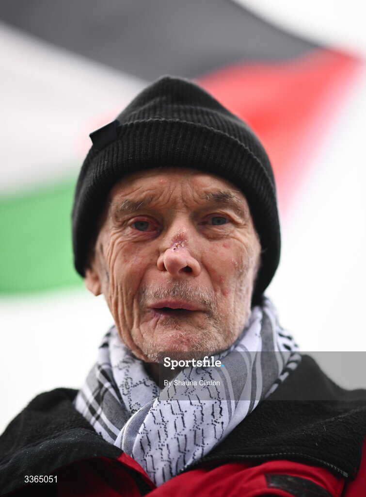 22 February 2026; Former Dublin player David Hickey protests outside the grounds before the Allianz Football League Division 2 match between Louth and Tyrone at DEFY Pairc Mhuire in Ardee, Louth. Photo by Shauna Clinton/Sportsfile