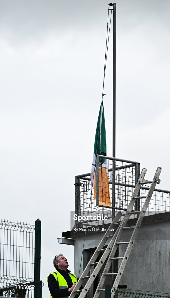 22 February 2026; Birr GAA clubman Dave Coffey raises the Irish tricolour before the Allianz Hurling League Division 1A match between Offaly and Galway at St Brendan's Park in Birr, Offaly. Photo by Piaras Ó Mídheach/Sportsfile