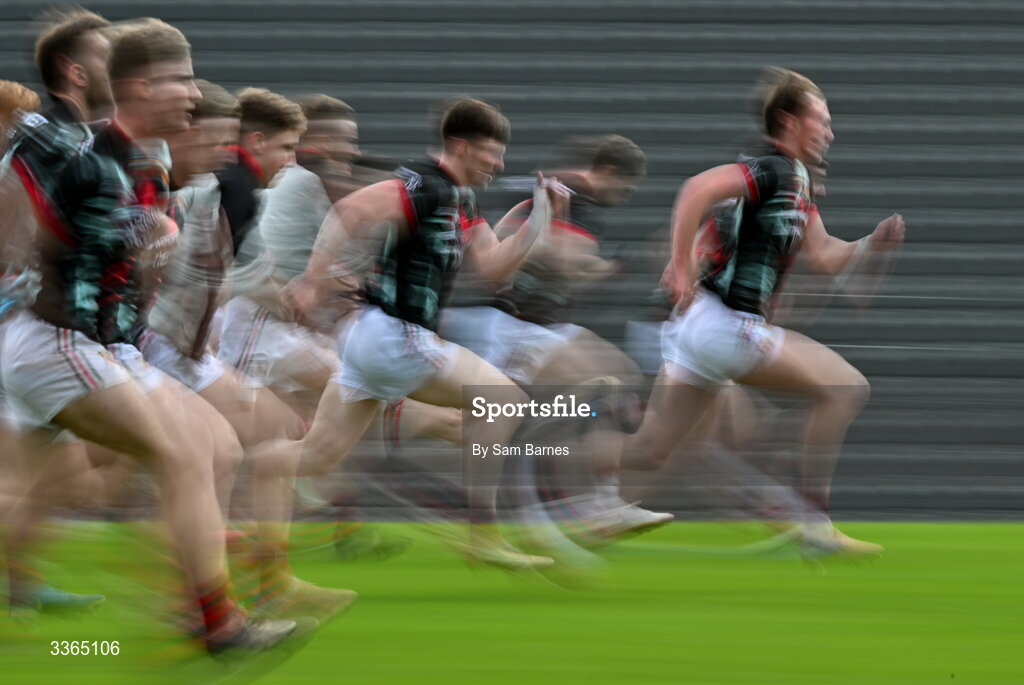 22 February 2026; Mayo players warm up before the Allianz Football League Division 1 match between Monaghan and Mayo at St Tiernach's Park in Clones, Monaghan. Photo by Sam Barnes/Sportsfile