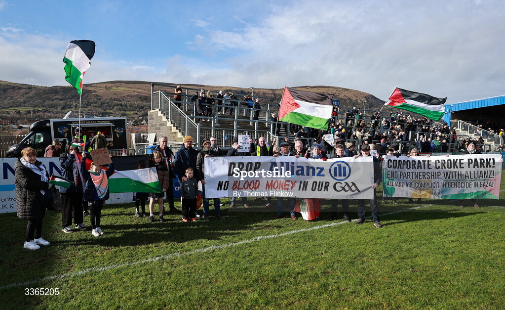 22 February 2026; An Allianz protest at half-time in the Allianz Hurling League Division 1A match between Antrim and Carlow at Corrigan Park in Belfast. Photo by Thomas Flinkow/Sportsfile