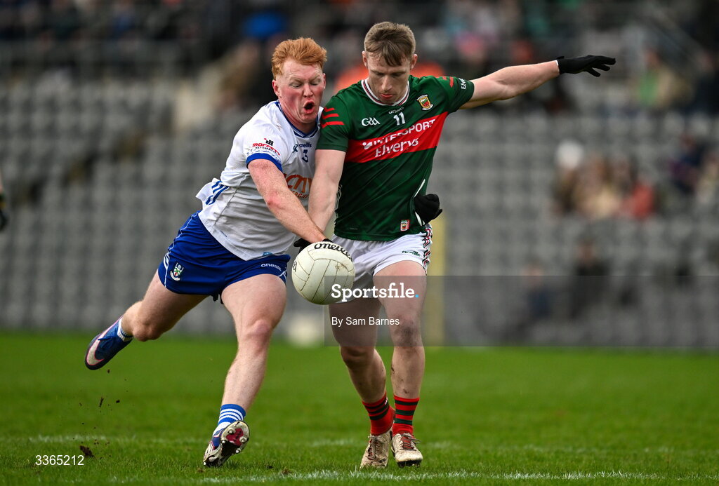 22 February 2026; Ryan O’Donoghue of Mayo is tackled by Ryan O’Toole of Monaghan during the Allianz Football League Division 1 match between Monaghan and Mayo at St Tiernach's Park in Clones, Monaghan. Photo by Sam Barnes/Sportsfile