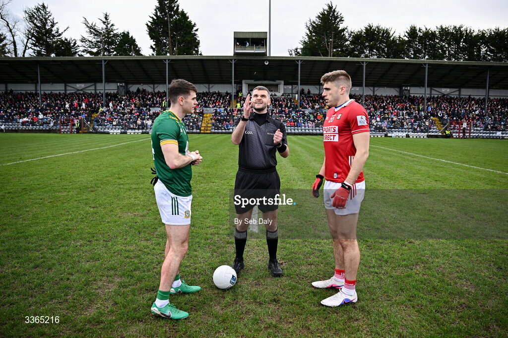22 February 2026; Referee Conor Dourneen with Meath captain Eoghan Frayne and Cork captain Ian Maguire before the Allianz Football League Division 2 match between Cork and Meath at Páirc Ui Rinn in Cork. Photo by Seb Daly/Sportsfile