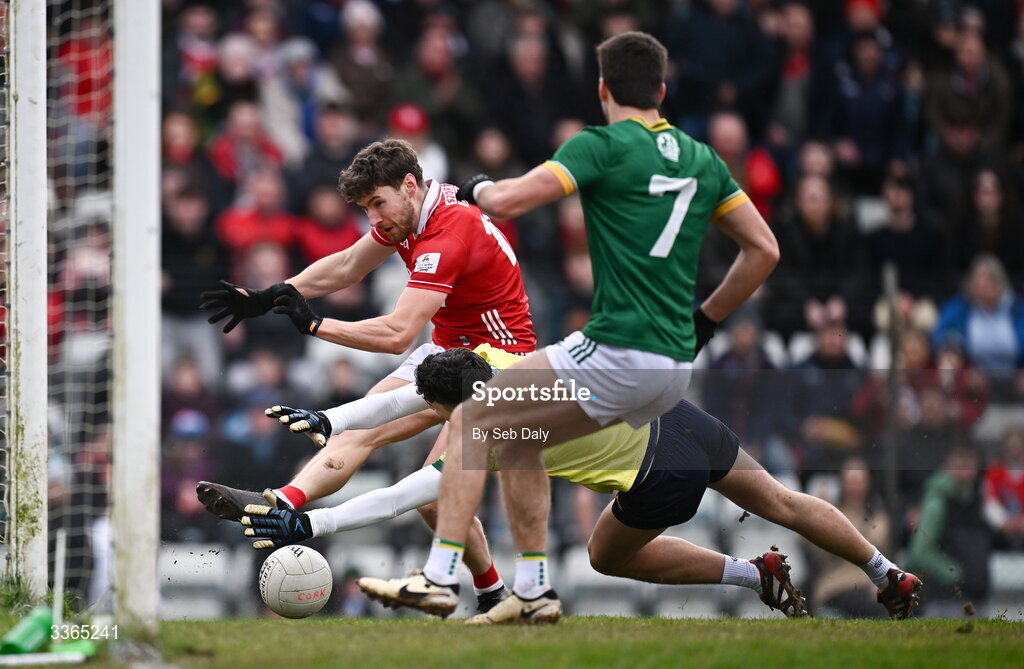 22 February 2026; Paul Walsh of Cork has a shot on goal saved by Meath goalkeeper Seán Brennan during the Allianz Football League Division 2 match between Cork and Meath at Páirc Ui Rinn in Cork. Photo by Seb Daly/Sportsfile