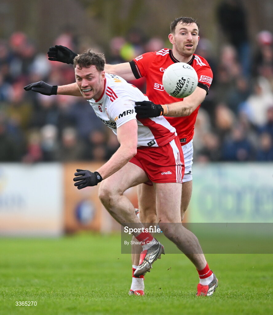 22 February 2026; Brian Kennedy of Tyrone is tackled by Sam Mulroy of Louth during the Allianz Football League Division 2 match between Louth and Tyrone at DEFY Pairc Mhuire in Ardee, Louth. Photo by Shauna Clinton/Sportsfile