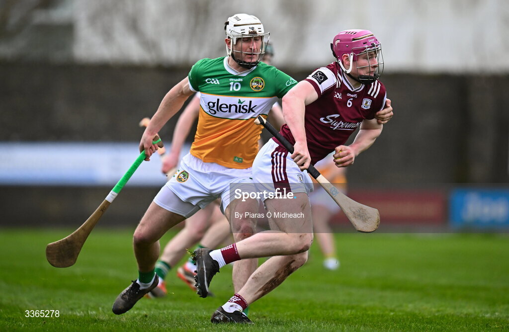 22 February 2026; Cillian Trayers of Galway in action against Oisín Kelly of Offaly during the Allianz Hurling League Division 1A match between Offaly and Galway at St Brendan's Park in Birr, Offaly. Photo by Piaras Ó Mídheach/Sportsfile