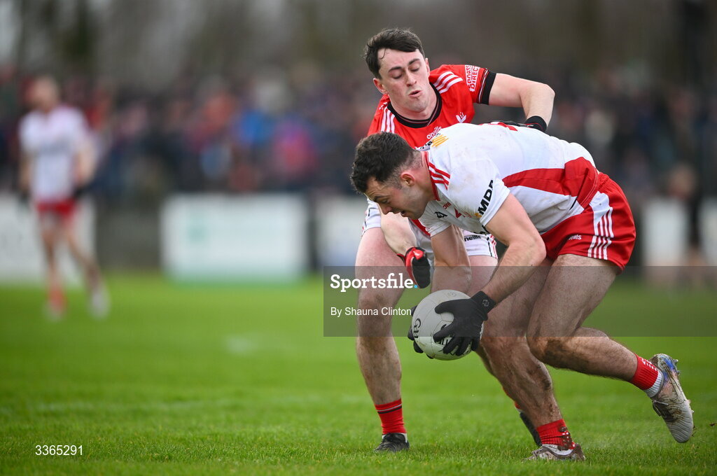 22 February 2026; Michael Rafferty of Tyrone is tackled by Kieran McArdle of Louth during the Allianz Football League Division 2 match between Louth and Tyrone at DEFY Pairc Mhuire in Ardee, Louth. Photo by Shauna Clinton/Sportsfile