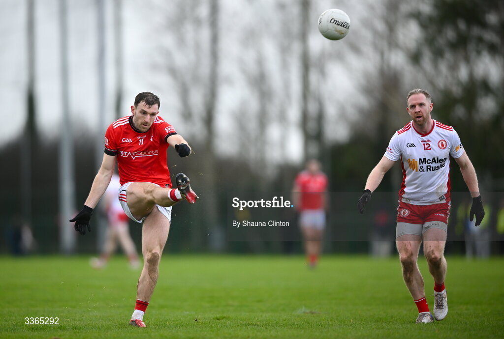 22 February 2026; Sam Mulroy of Louth kicks a score during the Allianz Football League Division 2 match between Louth and Tyrone at DEFY Pairc Mhuire in Ardee, Louth. Photo by Shauna Clinton/Sportsfile
