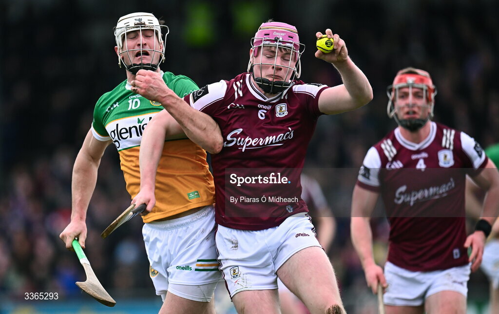 22 February 2026; Cillian Trayers of Galway in action against Oisín Kelly of Offaly during the Allianz Hurling League Division 1A match between Offaly and Galway at St Brendan's Park in Birr, Offaly. Photo by Piaras Ó Mídheach/Sportsfile