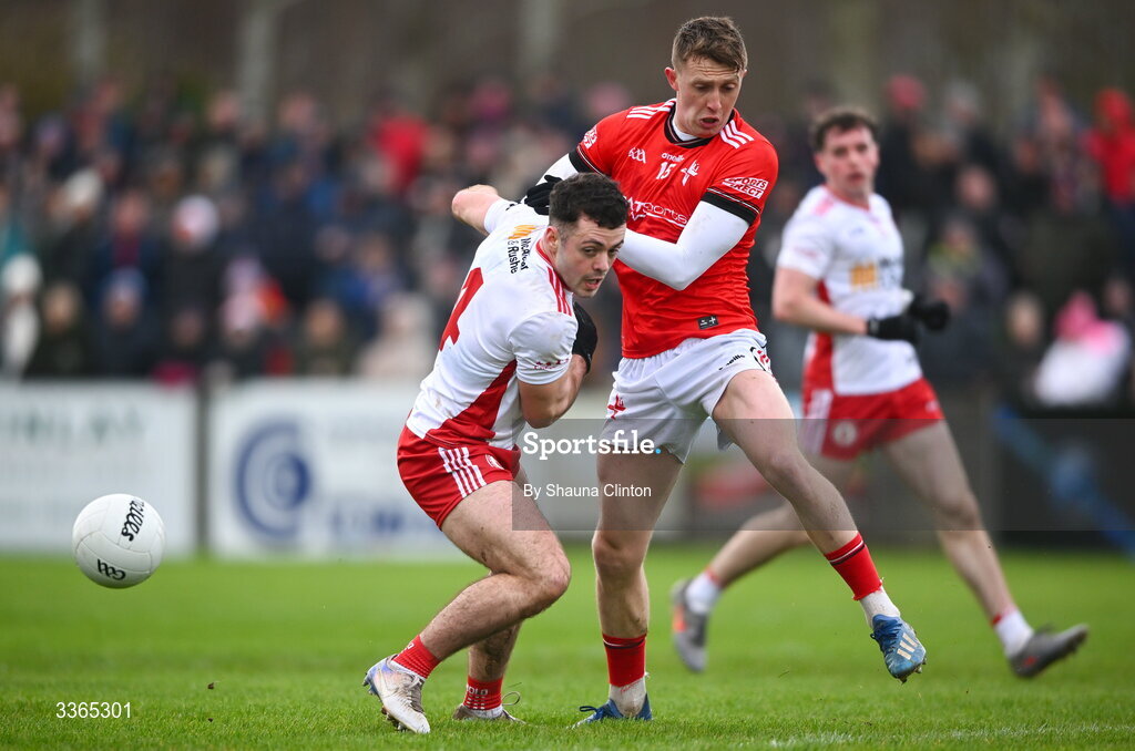 22 February 2026; Michael Rafferty of Tyrone in action against Ryan Burns of Louth during the Allianz Football League Division 2 match between Louth and Tyrone at DEFY Pairc Mhuire in Ardee, Louth. Photo by Shauna Clinton/Sportsfile