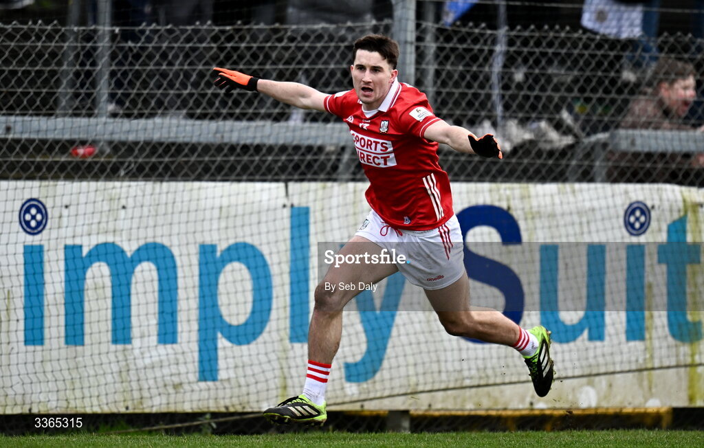 22 February 2026; Chris Óg Jones of Cork celebrates after scoring his side's first goal during the Allianz Football League Division 2 match between Cork and Meath at Páirc Ui Rinn in Cork. Photo by Seb Daly/Sportsfile
