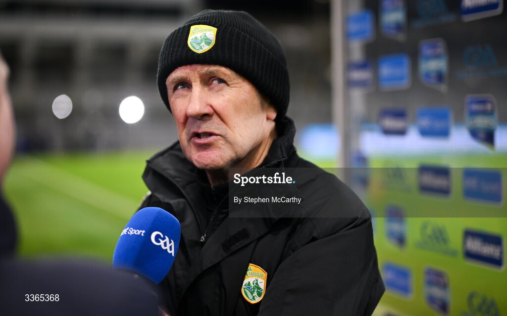 21 February 2026; Kerry manager Jack O'Connor speaks to RTÉ following the Allianz Football League Division 1 match between Dublin and Kerry at Croke Park in Dublin. Photo by Stephen McCarthy/Sportsfile