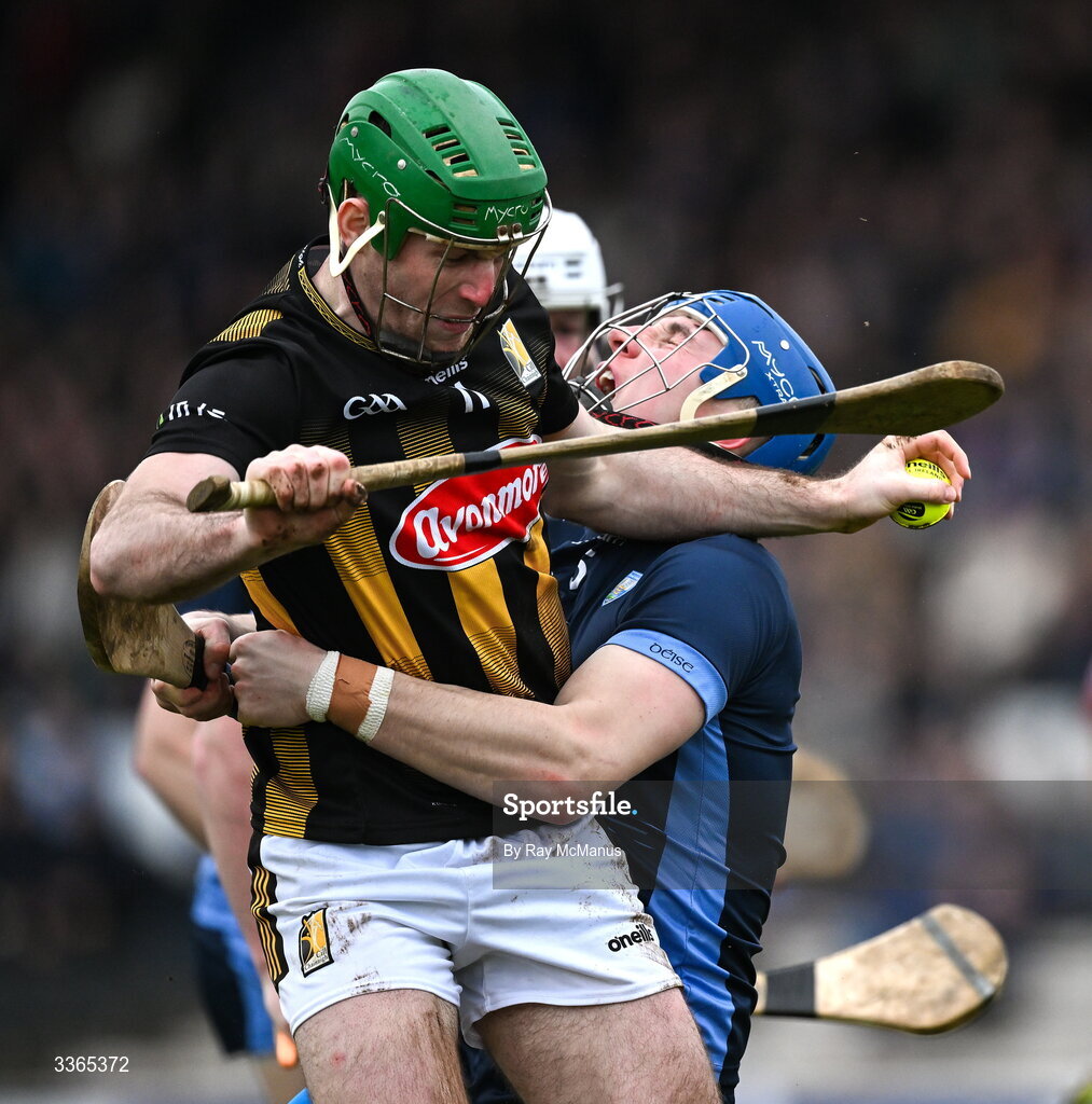 22 February 2026; Eoin Cody of Kilkenny is tackled by Paddy Leavey of Waterford, and a free was awarded to Waterford, during the Allianz Hurling League Division 1A match between Kilkenny and Waterford at UPMC Nowlan Park in Kilkenny. Photo by Ray McManus/Sportsfile