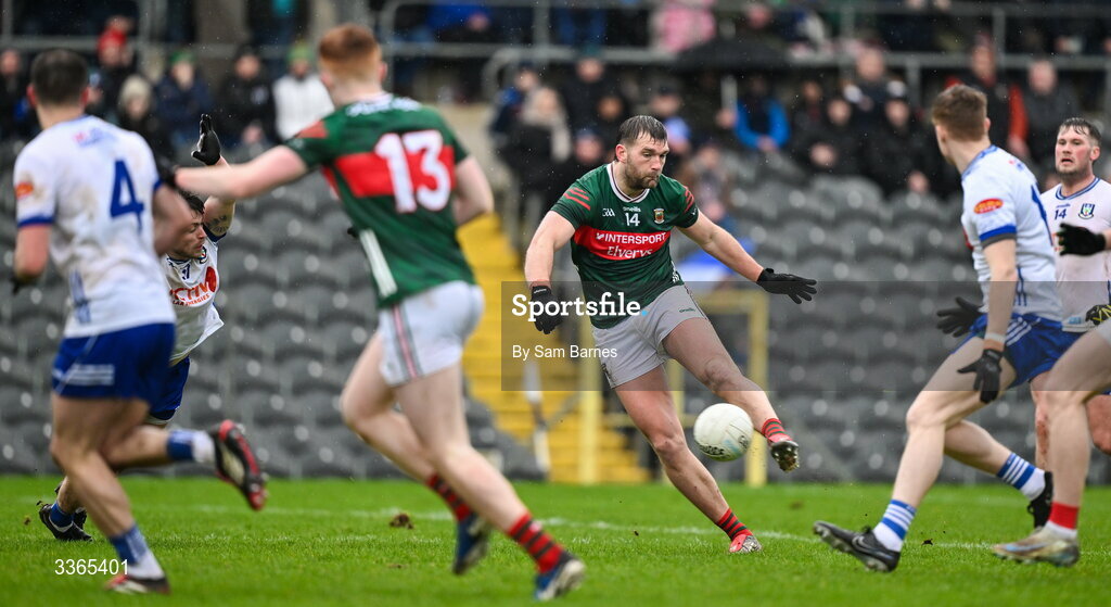 22 February 2026; Aidan O’Shea of Mayo scores his side's first goal during the Allianz Football League Division 1 match between Monaghan and Mayo at St Tiernach's Park in Clones, Monaghan. Photo by Sam Barnes/Sportsfile