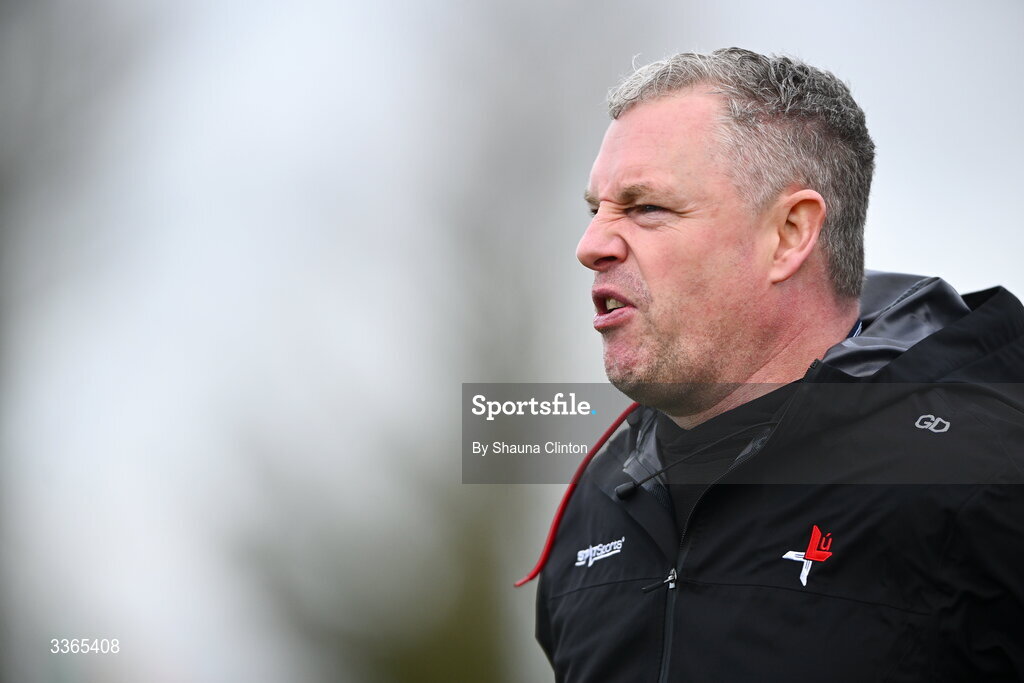 22 February 2026; Louth manager Gavin Devlin reacts during the Allianz Football League Division 2 match between Louth and Tyrone at DEFY Pairc Mhuire in Ardee, Louth. Photo by Shauna Clinton/Sportsfile