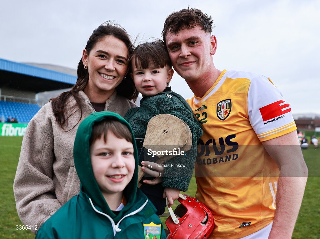 22 February 2026; Eoin O'Neill of Antrim with his sister and Antrim Camogie player Nicole McAtamney and his nephews Dan, front, and Joe after his side's victory in the Allianz Hurling League Division 1A match between Antrim and Carlow at Corrigan Park in Belfast. Photo by Thomas Flinkow/Sportsfile