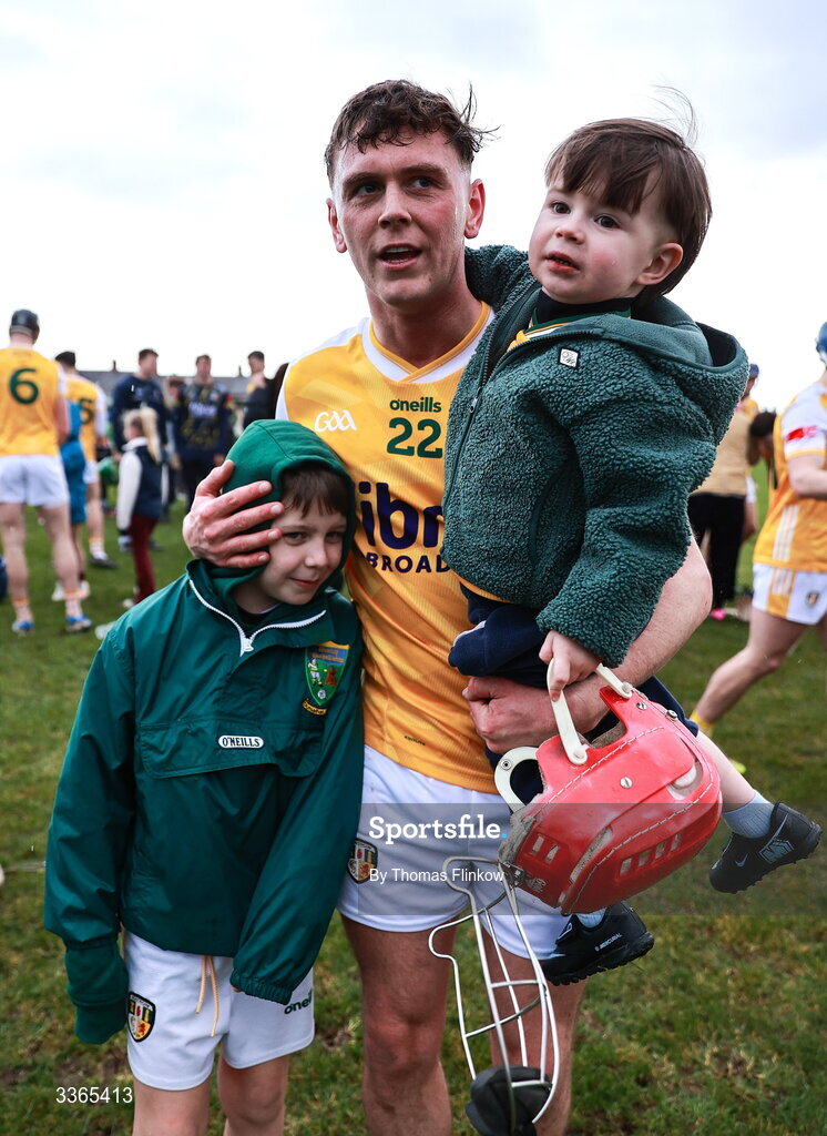 22 February 2026; Eoin O'Neill of Antrim with his nephews Dan, left, and Joe after his side's victory in the Allianz Hurling League Division 1A match between Antrim and Carlow at Corrigan Park in Belfast. Photo by Thomas Flinkow/Sportsfile