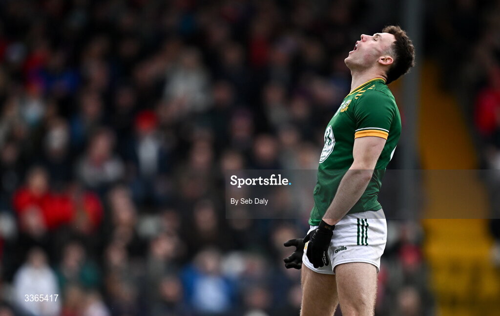 22 February 2026; Jordan Morris of Meath reacts after failing to convert a chance on goal during the Allianz Football League Division 2 match between Cork and Meath at Páirc Ui Rinn in Cork. Photo by Seb Daly/Sportsfile