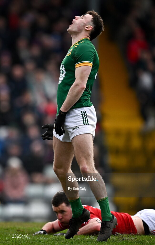 22 February 2026; Jordan Morris of Meath reacts after failing to convert a chance on goal during the Allianz Football League Division 2 match between Cork and Meath at Páirc Ui Rinn in Cork. Photo by Seb Daly/Sportsfile