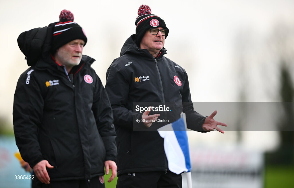 22 February 2026; Tyrone manager Malachy O'Rourke, right, and management react during the Allianz Football League Division 2 match between Louth and Tyrone at DEFY Pairc Mhuire in Ardee, Louth. Photo by Shauna Clinton/Sportsfile