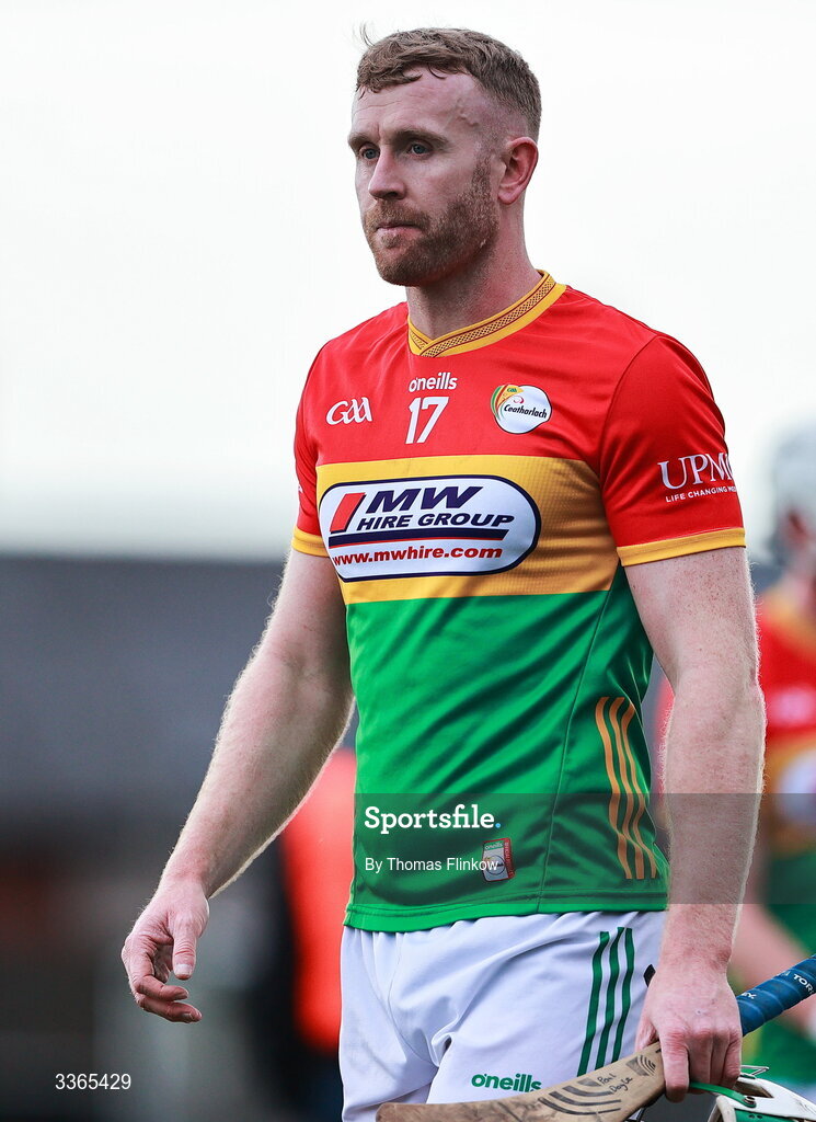 22 February 2026; A dejected Paul Doyle of Carlow after his side's defeat in the Allianz Hurling League Division 1A match between Antrim and Carlow at Corrigan Park in Belfast. Photo by Thomas Flinkow/Sportsfile