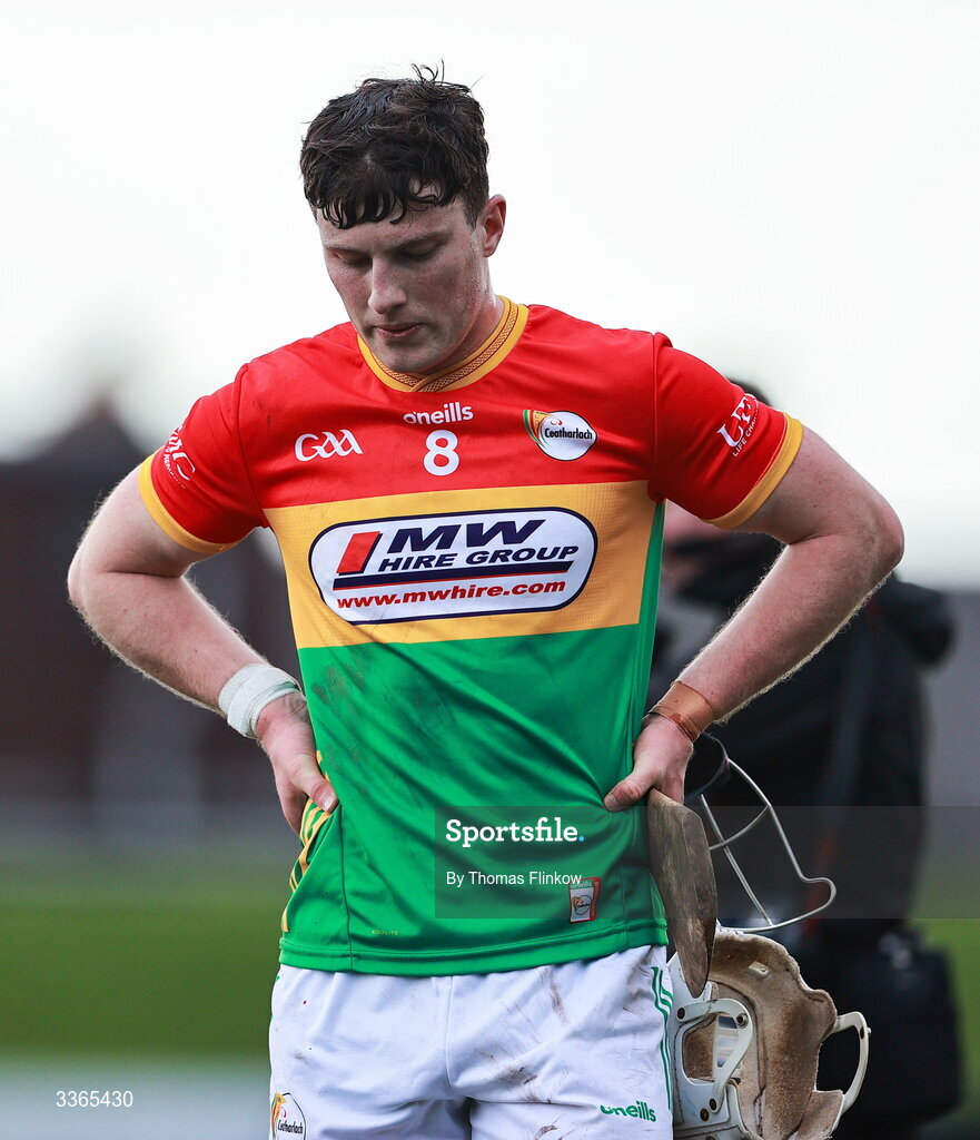 22 February 2026; A dejected Fiachra Fitzpatrick of Carlow after his side's defeat in the Allianz Hurling League Division 1A match between Antrim and Carlow at Corrigan Park in Belfast. Photo by Thomas Flinkow/Sportsfile
