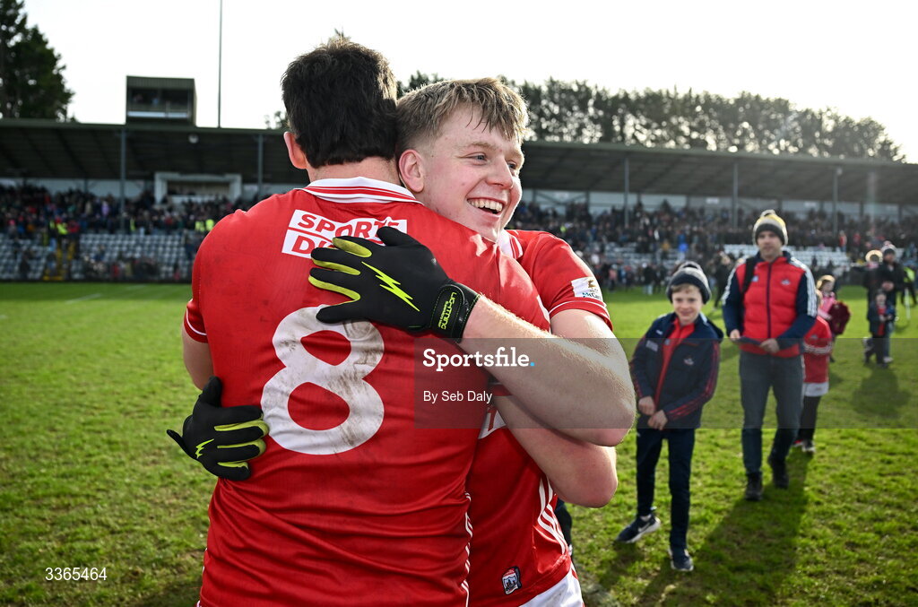 22 February 2026; Cork players Dara Sheedy, right, and Colm O’Callaghan after their side's victory in the Allianz Football League Division 2 match between Cork and Meath at Páirc Ui Rinn in Cork. Photo by Seb Daly/Sportsfile