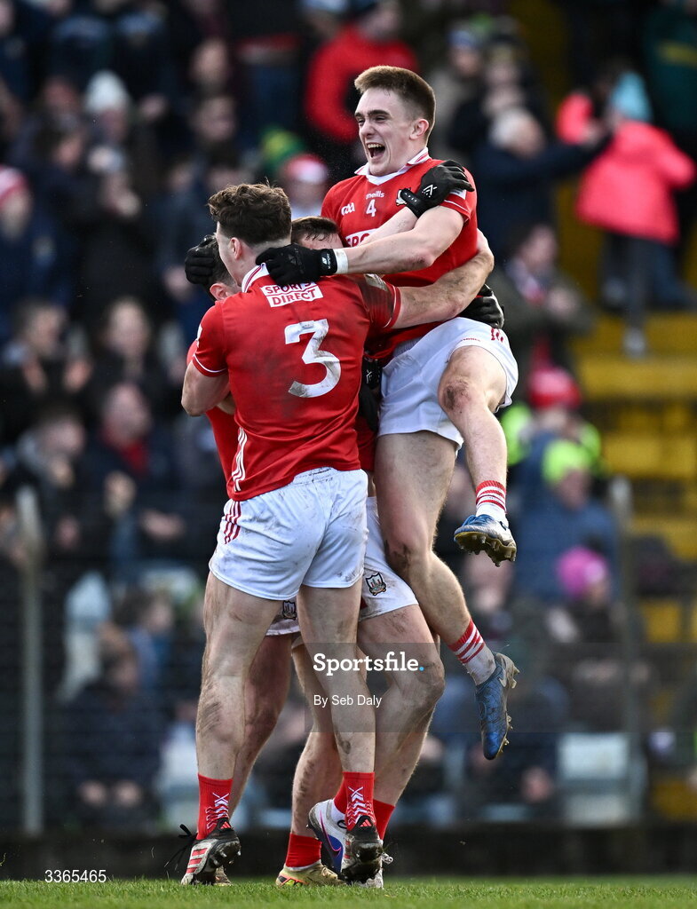 22 February 2026; Cork players celebrate after their side's victory in during the Allianz Football League Division 2 match between Cork and Meath at Páirc Ui Rinn in Cork. Photo by Seb Daly/Sportsfile