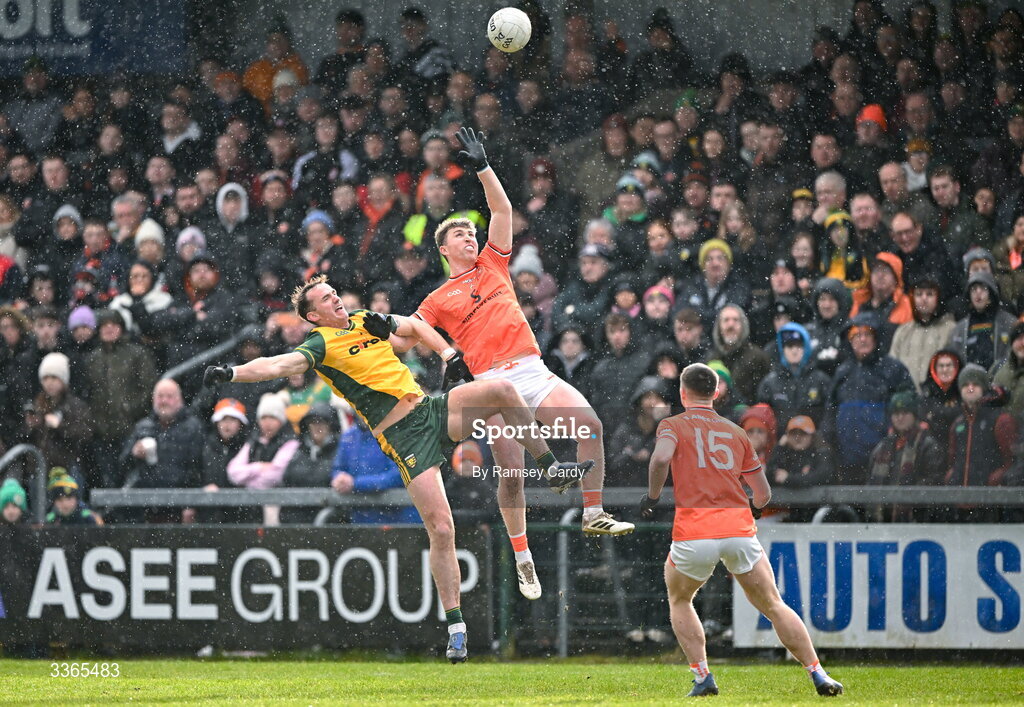 22 February 2026; Jason McGee of Donegal in action against Tiernan Kelly of Armagh during the Allianz Football League Division 1 match between Armagh and Donegal at BOX-IT Athletic Grounds in Armagh. Photo by Ramsey Cardy/Sportsfile