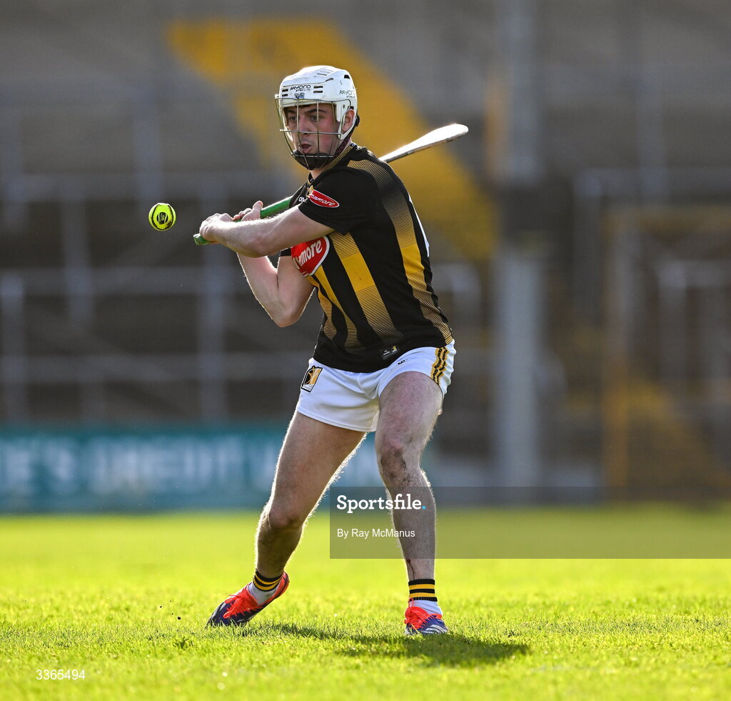 22 February 2026; Cian Kenny of Kilkenny strikes a late free to win the Allianz Hurling League Division 1A match between Kilkenny and Waterford at UPMC Nowlan Park in Kilkenny. Photo by Ray McManus/Sportsfile