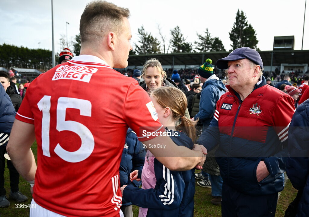22 February 2026; Cork manager John Cleary, right, and Steven Sherlock after their side's victory in the Allianz Football League Division 2 match between Cork and Meath at Páirc Ui Rinn in Cork. Photo by Seb Daly/Sportsfile
