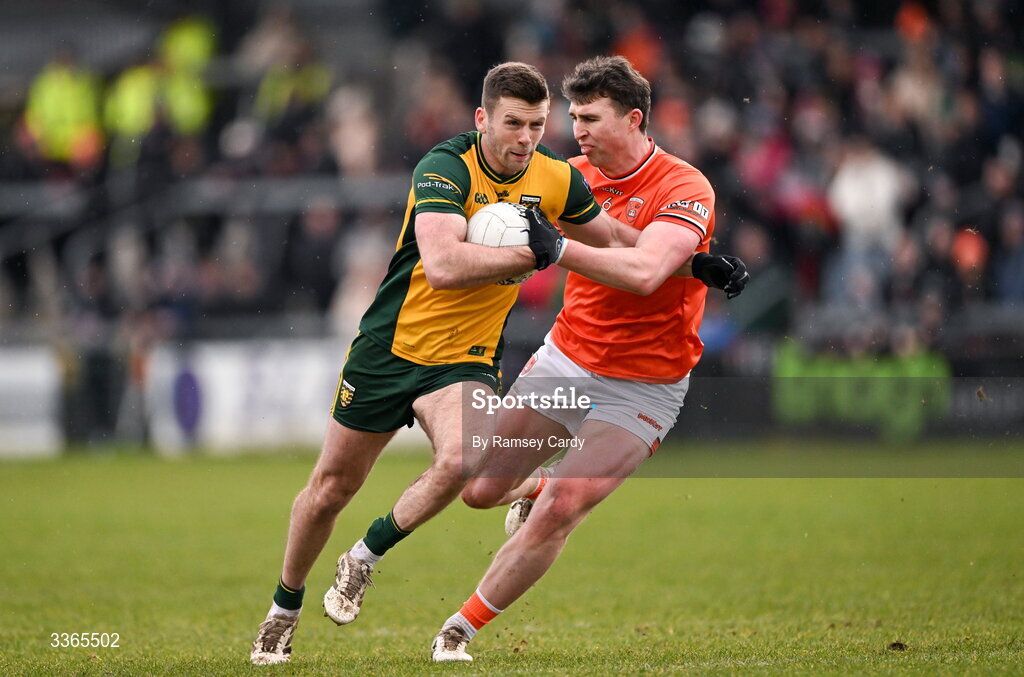 22 February 2026; Eoghan Bán Gallagher of Donegal in action against Tiernan Kelly of Armagh during the Allianz Football League Division 1 match between Armagh and Donegal at BOX-IT Athletic Grounds in Armagh. Photo by Ramsey Cardy/Sportsfile