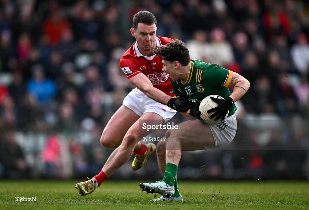 22 February 2026; James Conlon of Meath in action against Maurice Shanley of Cork during the Allianz Football League Division 2 match between Cork and Meath at Páirc Ui Rinn in Cork. Photo by Seb Daly/Sportsfile