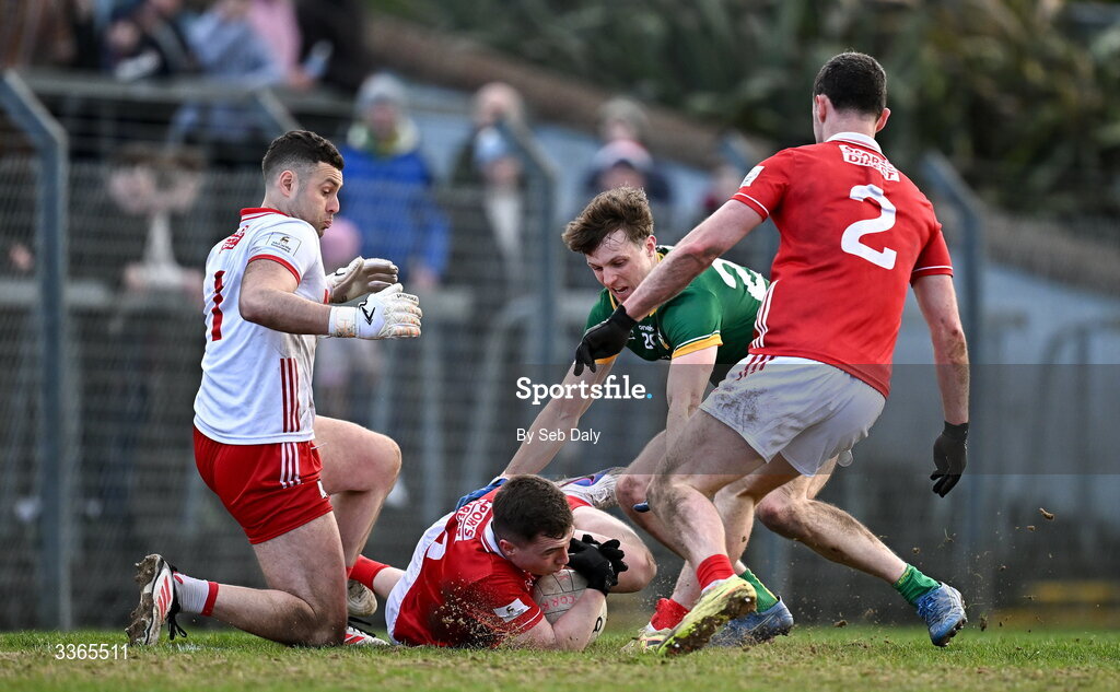 22 February 2026; Luke Fahy of Cork gathers the ball on the ground after blocking a shot from Meath's Adam O’Neill during the Allianz Football League Division 2 match between Cork and Meath at Páirc Ui Rinn in Cork. Photo by Seb Daly/Sportsfile