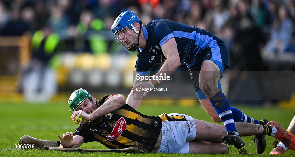 22 February 2026; Eoin Cody of Kilkenny is tackled by Paddy Leavey of Waterford during the Allianz Hurling League Division 1A match between Kilkenny and Waterford at UPMC Nowlan Park in Kilkenny. Photo by Ray McManus/Sportsfile