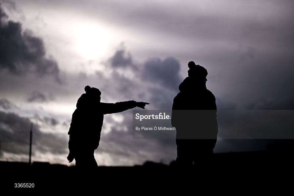 22 February 2026; Galway manager Micheál Donoghue, right, and selector Noel Larkin during the Allianz Hurling League Division 1A match between Offaly and Galway at St Brendan's Park in Birr, Offaly. Photo by Piaras Ó Mídheach/Sportsfile