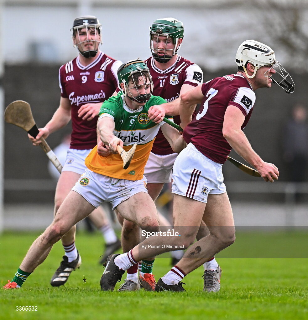 22 February 2026; Daithí Burke of Galway has his helmet come loose as he's tackled by Ter Guinan of Offaly during the Allianz Hurling League Division 1A match between Offaly and Galway at St Brendan's Park in Birr, Offaly. Photo by Piaras Ó Mídheach/Sportsfile