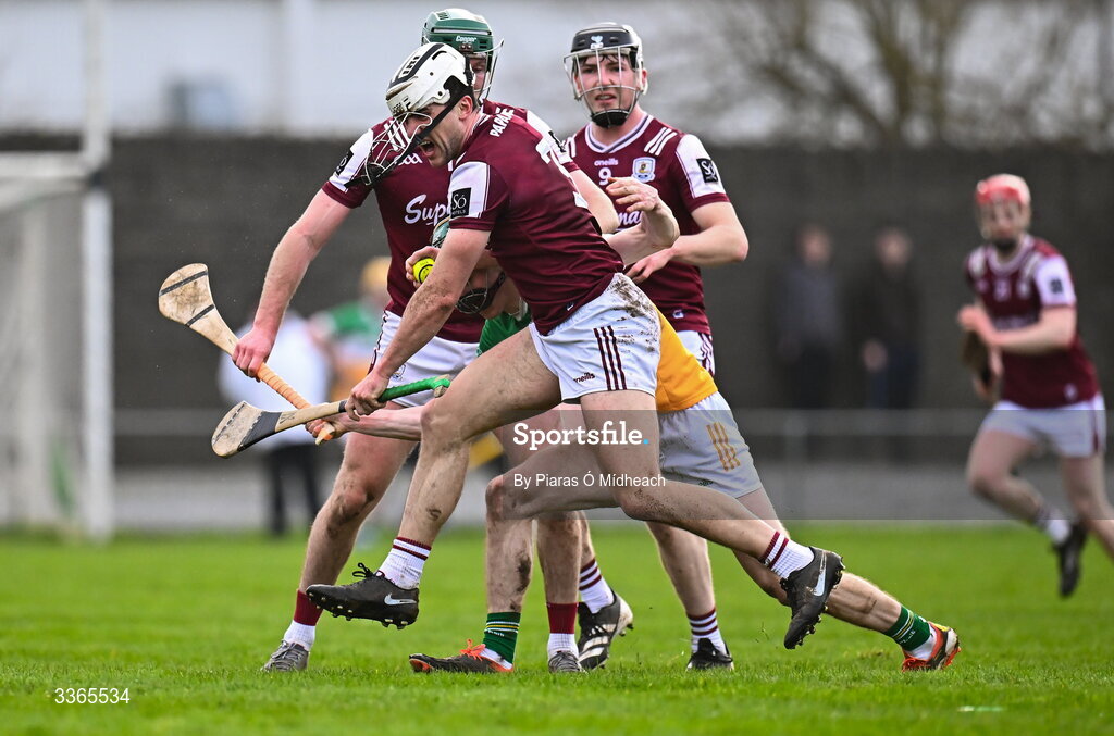 22 February 2026; Daithí Burke of Galway has his helmet come loose as he's tackled by Ter Guinan of Offaly during the Allianz Hurling League Division 1A match between Offaly and Galway at St Brendan's Park in Birr, Offaly. Photo by Piaras Ó Mídheach/Sportsfile