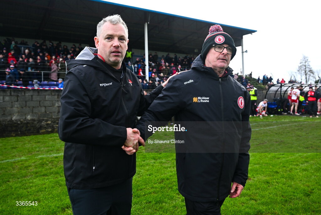 22 February 2026; Louth manager Gavin Devlin and Tyrone manager Malachy O'Rourke shake hands after the Allianz Football League Division 2 match between Louth and Tyrone at DEFY Pairc Mhuire in Ardee, Louth. Photo by Shauna Clinton/Sportsfile