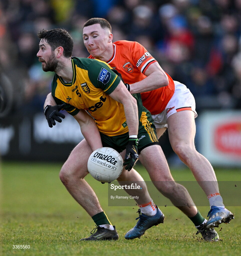 22 February 2026; Ryan McHugh of Donegal in action against Oisín Conaty of Armagh during the Allianz Football League Division 1 match between Armagh and Donegal at BOX-IT Athletic Grounds in Armagh. Photo by Ramsey Cardy/Sportsfile