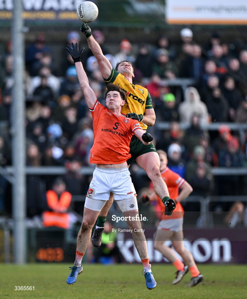 22 February 2026; Hugh McFadden of Donegal in action against Ben Crealey of Armagh during the Allianz Football League Division 1 match between Armagh and Donegal at BOX-IT Athletic Grounds in Armagh. Photo by Ramsey Cardy/Sportsfile