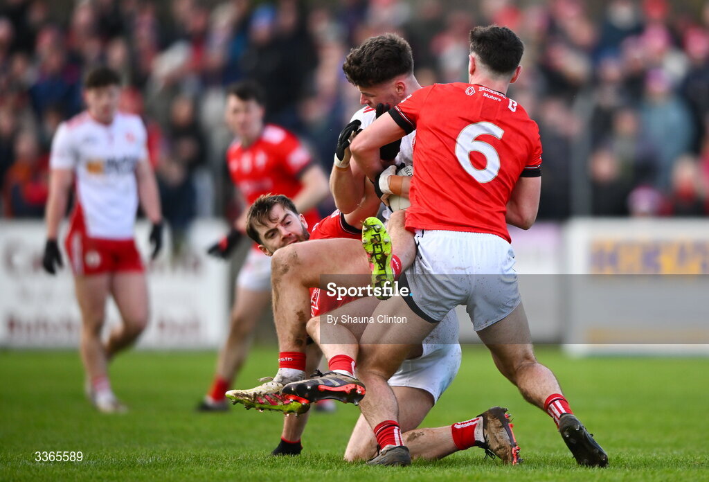 22 February 2026; Michael McKernan of Tyrone is fouled by Louth players Dermot Campbell, left, and Emmett Carolan during the Allianz Football League Division 2 match between Louth and Tyrone at DEFY Pairc Mhuire in Ardee, Louth. Photo by Shauna Clinton/Sportsfile