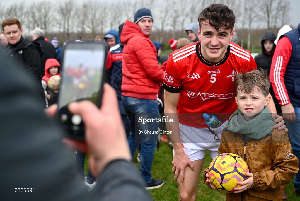 22 February 2026; Tadhg McDonnell of Louth with supporters after his side's victory in the Allianz Football League Division 2 match between Louth and Tyrone at DEFY Pairc Mhuire in Ardee, Louth. Photo by Shauna Clinton/Sportsfile
