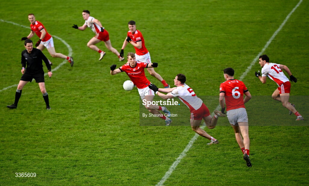 22 February 2026; Ronan Cassidy of Tyrone makes a pass during the Allianz Football League Division 2 match between Louth and Tyrone at DEFY Pairc Mhuire in Ardee, Louth. Photo by Shauna Clinton/Sportsfile